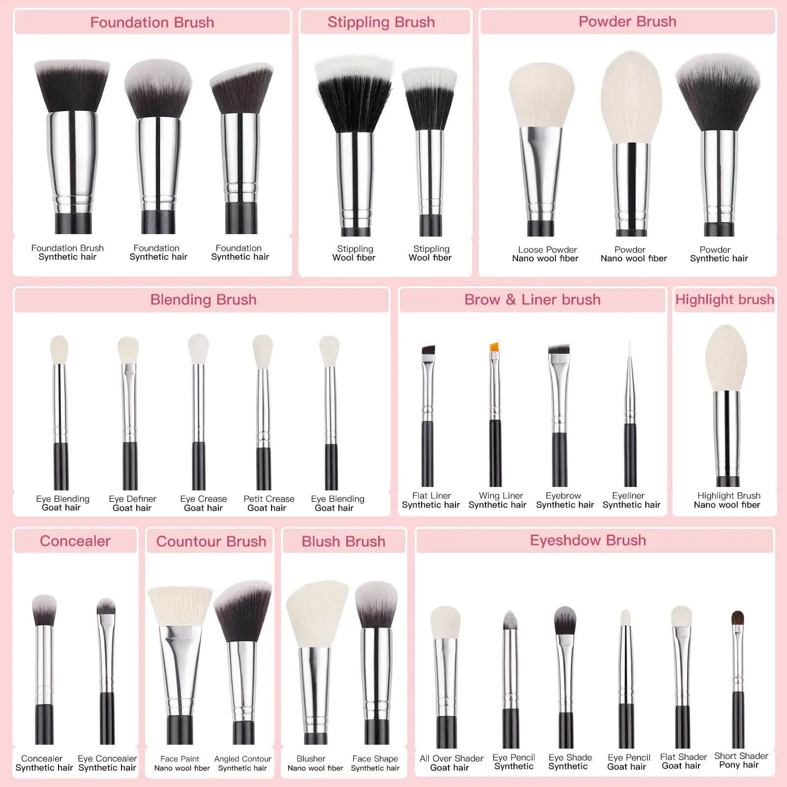 ✅ Pensulele sunt realizate dintr-o combinație de păr natural (capră, ponei, lână) și fibre sintetice premium, asigurând o aplicare precisă și un blending impecabil.