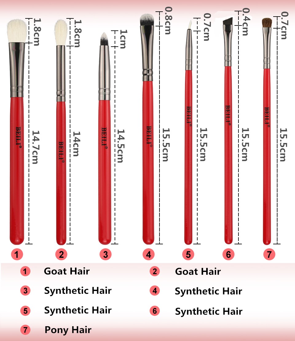 Set 7 pensule make-up Beili Red contine pensule fabricate din materiale precum parul de capra, parul de ponei sau par sintetic.